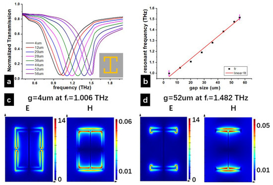 (a) The transmission spectra for devices with symmetrical gaps expanding from 4 μm to 56 μm. The inset illustrates such a change in gap size. (b) Relationship of resonant frequencies with different gap sizes and the linear fitting line. (c,d) show the E-field and H-field distribution maps for devices with g = 4 μm and g = 52 μm, respectively, at their respective resonant frequencies. The x- and y-span in (c,d) both range from −50 to 50 μm. The color bar extends linearly from minimum to the maximum value. The x- and y- scales as well as the linear color bar settings are kept the same in all the following E-field and H-field distribution images.