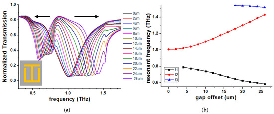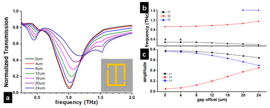 Next, we investigated the impact of asymmetric changes in both sides of the Co-SRR. First, the gaps on both sides were offset in opposite directions, with the offset increasing from 0 to 24 μm at a step of 4 μm. The gap size was kept constant at 4 μm throughout all simulations. The transmission spectra obtained are presented in Figure 6a. Three resonant dips were observed. The resonant frequencies and corresponding transmission amplitudes were extracted from the spectra and plotted against the gap offset, as shown in Figure 6b and Figure 6c, respectively.