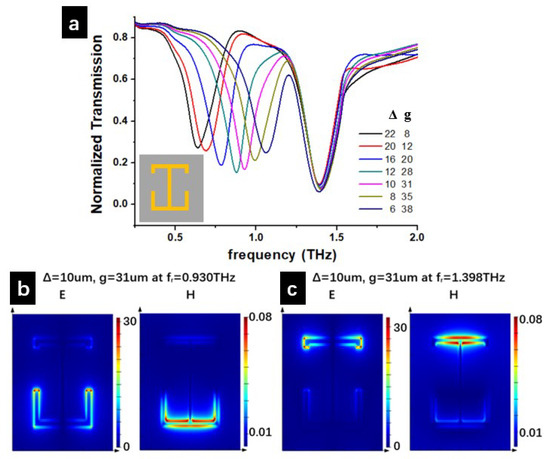 To gain deeper insights into these resonances, we examined the E-field and H-field distribution maps for each resonance. A typical device with Δ = 10 μm and g = 31 μm was selected, and its E-field and H-field distribution maps are presented in Figure 4b,c, respectively. It becomes obvious that at different resonant frequencies, the upper frame and the lower frame are excited one at a time, independent of each other. The first resonance can be primarily attributed to the lower frame alone, and the second to the upper. From the perspective of an analogous LC circuit, at the lower resonant frequency, electrons are excited to oscillate along the lower frame, which has a longer current path length and a correspondingly longer “round-trip time”. Conversely, at the higher resonant frequency, electrons oscillate along the shorter frame, resulting in a reduced travel period. Therefore, we tabulated the widths of the upper (b) and lower (a) frames in Table 1 for the devices used in Figure 4a. Not surprisingly, the widths of the upper frames remained almost constant at about 6 μm, whereas that of the upper varied significantly from 50 μm to 19 μm. The slight increment in b for larger gap sizes compensates for the diminishing coupling between the upper and lower frames.