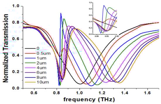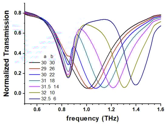 With the same principle, to achieve independent tuning of the second resonance, the width of the lower frame (a) was kept almost constant at about 30 μm, with slight variations to compensate for the diminishing coupling effect between the frames, whereas that of the upper frame (b) varied from 30 to 6 μm. The resulting transmission spectra are shown in Figure 5. The first resonance remained fixed at 0.850 THz, despite its increased intensity attributed to increased asymmetry. In contrast, the second resonance shifted from 1.006 THz (b = 30 μm) to 1.398 THz (b = 6 μm), resulting in a frequency shift of 392 GHz.