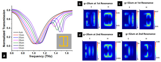 (a) Transmission spectra for devices where only one gap expands from 4 μm to 52 μm at a step of 8 μm. The gap center is fixed at y = 0 in all cases. (b,c) show the E-field and H-field distribution maps at the first resonance for the devices with gap sizes g = 20 μm and g = 52 μm, respectively. (d,e) show the E-field and H-field distribution maps at the second resonance for the devices with gap sizes g = 20 μm and g = 52 μm, respectively.