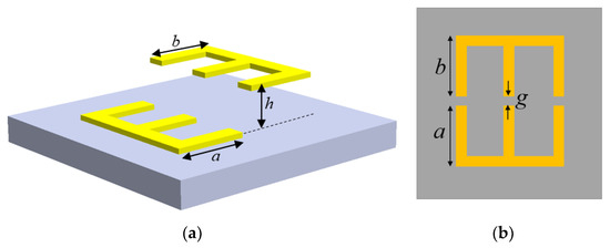Next, spatial asymmetry was created in the Co-SRR and its influence on the resonances was analyzed. To do so, a gap of 4 μm was introduced into the center of the middle bar such that the structure broke into two face-to-face “E”-shaped resonators. Then, the upper “E” was elevated to a plane that is at a height of h above the lower part (see Figure 8a). h was defined to be the distance between the top surface of the upper “E” and the top surface of the lower “E”. The width of the outer frame of the lower “E” was defined as a; and that of the upper “E” was defined as b (see Figure 8b). Such structures can be realized via a MEMS technique [20,30]. In the following studies, all three gaps are kept at 4 μm wide and the other parameters remain the same as the planar structures mentioned previously.