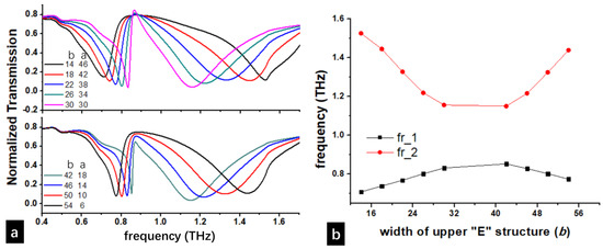 Another thing to note is the Q-factor of the first resonance dip. The dips become shaper with increased symmetry. The Q and FOM for the device with b = 30 μm are 15.98 and 15.38, respectively. They are 44.8 and 40.1 for the device with b = 42 μm. The Q and FOM values for spectra displayed in Figure 9 and Figure 10a are tabulated in Table 2. It is obvious that when the width of the upper frame (b) is slightly larger than that of the lower frame (a), as exemplified by b = 42 μm, the largest Q and FOM can be obtained. This can be seen as a compensation for the asymmetry caused by the lack of substrate beneath the upper “E” structure, achieved by increasing the width of the upper frame (b), thereby restoring a more balanced overall symmetry. In other words, when b = 42 μm, the upper and lower structure approaches the most symmetric layout considering the single-sided substrate.