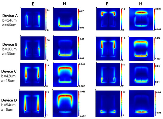 To gain a deeper understanding of the dual resonant dips in the transmission spectra, we examined the E-field and H-field distributions across four typical devices. For consistency with previous work on planar devices, the maps were also obtained at the interface between the lower “E” pattern and the substrate. These devices represent the highest and lowest levels of symmetry within the two groups categorized by b ≤ a and b > a with h = 2 μm, respectively. They will be referred to as Device A (b = 14 μm, a = 46 μm), B (b = 30 μm, a = 30 μm), C (b = 42 μm, a = 18 μm), and D (b = 54 μm, a = 6 μm) hereinafter for ease of description. The E and H distribution maps are presented in Figure 11.