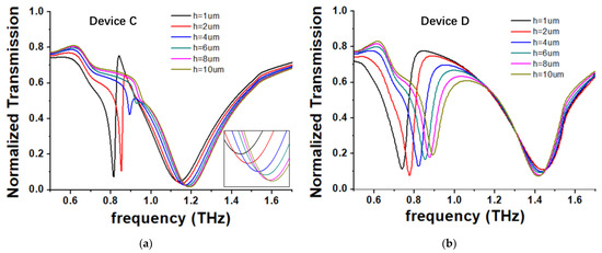 With the understanding of the coupling in L-mode and U-mode, we further verified the relationship between resonances and h for Device C and D. The transmission spectra for these two devices are presented in Figure 12a and Figure 12b, respectively. For both Devices, the first resonance, which is attributed by the U-mode with strong coupling between the layers, shows significant blue shift with increasing h. For Device C, due to the low asymmetry in structure, resonance hybridization can be spotted as the first resonance shifts to close proximity of the second resonance (h ≥ 4 μm). Such hybridization effect can also be spotted in Device B with a similarly highly symmetric layout, when h is at 0.5 μm (see Figure 9). Blue shifts in both resonances in Device C and the first resonance in Device D, as shown in Figure 12, confirmed the existence of interlayer capacitance. The blue shift is large for the first resonance, and small for the second resonance, due to the variation in coupling strength in U-mode and L-mode. Similarly to Device B, the weak coupling in L-mode gradually disappear at higher h, resulting in less and less shift in the second resonance of Device C. Lastly, the second resonance is almost stable for Device D, because as asymmetry level increases, the coupling in L-mode is too weak to make a significant impact on the second resonance.