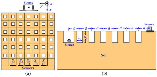 The design of seismic metamaterials is typically based on periodic structures and symmetry. Periodic structures possess translational symmetry, which allows for effective control over the propagation of seismic waves. Figure 1 illustrates the schematic of the SM structure and the experiment. The structure consists of a 6 × 7 periodic and symmetric square hole array with a lattice constant, denoted as a. The unit cell of the structure features a square hole with a side length of L1 and a depth of H0. The vibration source and five sets of sensors are symmetrically placed at the front and back of the periodic structure.