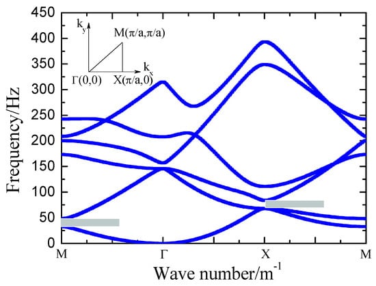 During the two-dimensional simulation process, we utilized the finite element software COMSOL (version 6.2) Multiphysics, along with Bloch periodic boundary conditions, to calculate the band gaps of the periodic array that is shown in Figure 1. The physical parameters used were a density of ρ = 1500 kg/m3, Young’s modulus E = 100 MPa, and Poisson’s ratio ν = 0.3. The optimized geometric parameters for the SMs, obtained through iterative refinement, were a = 1 m, L1 = 0.27 m, and H0 = 0.35 m. The simulated band structure is shown in Figure 2, where a local band gap can be observed in the MΓ direction, ranging from 34 Hz to 50 Hz, and another local band gap can be seen in the XM direction, ranging from 70 Hz to 82 Hz.