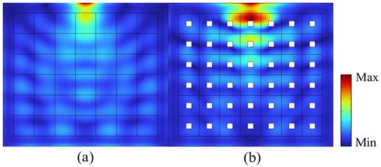 Figure 3 illustrates the schematic distribution of the displacement field when a surface wave with a frequency of 50 Hz propagates in an SM structure, where (a) represents the scenario without an SM structure, and (b) describes the scenario with an SM structure. In the figures, deeper red indicates larger displacement deformation, while deeper blue indicates smaller displacement deformation. The comparison between (a) and (b) clearly shows that most of the energy is concentrated in the region of the SM, indicating that the designed SM has a significant attenuation effect on the surface waves, thereby generating a band gap.