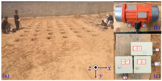 The experimental site, as shown in Figure 4a, where the 6 × 7 periodic and symmetric square hole array was arranged based on the simulation, is located in the North Campus of the Institute of Disaster Prevention. From the perspective of the SM’s structure, the square holes here are somewhat innovative, as they differ from the circular holes that have been designed by other researchers [,]. The soil type is stiff clay, with a relative humidity of 60–70%. The Love wave velocity in the soil is 105 m/s. The vibration source is an eccentric wheel vibrator (XDP-80DC-24, Figure 4b), powered by a 24 V DC power supply, with an adjustable frequency range of 20 Hz to 70 Hz, which is placed 0.5 m underground. Since signals below 40 Hz are weak and do not show significant differences from background noise, the frequency range for the vibration source was set to 40 Hz to 60 Hz during the experiment, with an interval of 2 Hz. A 24-bit data acquisition system was used to record the signals; a signal was considered valid if its energy exceeded five times that of the background noise and its main frequency matched the vibration machine’s frequency. Five sets of sensors (velocity range: low-frequency cutoff at −3 dB and bandwidth of 0.5 Hz to 150 Hz) were symmetrically positioned on the ground at the rear end of the SM structure, spaced 1 m apart and labeled S1 to S5 (Figure 1a). Compared to measuring wave attenuation only at the position that directly faces the wave source [,], observing at five different locations provides insights into the attenuation information of SMs for waves propagating in different directions.