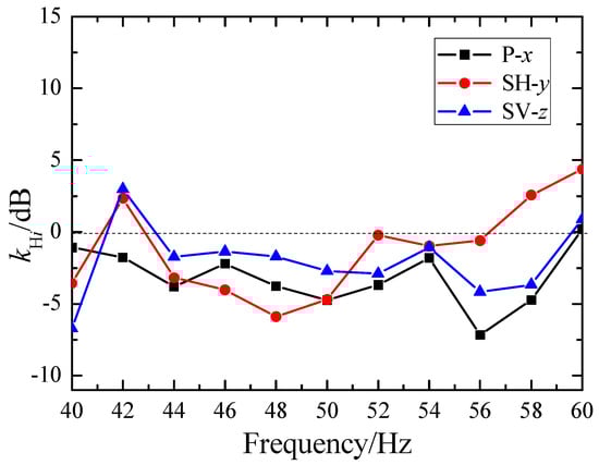 According to the experimental results presented in Figure 5, SH waves play a dominant role in the phenomenon of Bandgap-Induced Attenuation Mode Inversion. Within the bandgap range (below 50 Hz), the attenuation of SH waves is more effective than that of P waves and SV waves. This is primarily due to Bragg scattering occurring between different holes, where the periodic arrangement of holes more effectively interferes with the shear motion of SH waves in the low-frequency range. Regarding the reversal phenomenon of SH wave energy attenuation at 50 Hz, we believe that in the high-frequency range (above 50 Hz), the vibration absorption of wave energy by the hole array is enhanced. This leads to a weakening of the Bragg scattering effect and results in the reversal of SH wave energy attenuation.