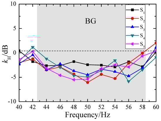 If we consider the vector sum of the energies of the x-, y-, and z-components of vibration as the total energy of the vibration, we can obtain the attenuation of the total energy of surface waves that were measured at different frequencies by five sensor (S1–S5) sets located at different positions, as shown in Figure 6. It is evident that there is a significant ultra-wide bandgap between 43 Hz and 58 Hz, indicating that the SM structure can effectively attenuate surface waves within this frequency range.