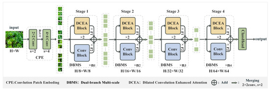 The four feature extraction stages of MOSSNet all adopt a lightweight depth-wise structure, and each stage is composed of a different number of DBMS modules (1, 2, 8, 2 respectively). The design of DBMS fully considers the diversity and complexity of bryophyte images, presenting an overall horizontally symmetrical structure. MOSSNet extracts features through two parallel branches: one uses convolution operations to capture local features, and the other one uses the DCEA module to capture global features. Among them, the DCEA module uses dilated convolutions to achieve multi-scale feature fusion and integrates the global contextual information through the self-attention mechanism. The outputs of these two branches are combined by weighted fusion to effectively integrate local and global features. In addition, at the end of each of the first three stages, there is a merging layer (convolution layer with kernel size of 2 × 2 and stride of 2) expanding the number of channels. This merging not only reduces computational cost but also facilitates the layer-by-layer extraction of high-level semantic features.
