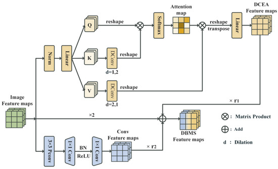 In addition, due to the locality and sparsity of the shallow attention matrix in ViT, it often exhibits low relevance when modeling the semantics of distant patches [35]. The characteristic limits the contribution of parts that are far from the central region of the image in global feature modeling. The DCEA module utilizes the dilated convolution technique to effectively extend the receptive field, thereby enhancing the correlation between distant features and central features. At the same time, it reduces the redundancy in global attention computation to a certain extent. The 3 × 3 kernel size for dilated convolution is chosen because it achieves a balance between receptive field size, computational complexity, and detail preservation. Moreover, a 3 × 3 kernel size is a widely validated standard in deep learning. Through this strategy, the DCEA module can integrate multi-scale information more efficiently in the process of global feature modeling.