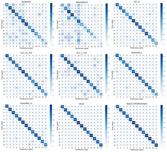 CPE module: To assess the effect of the CPE module on the subsequent DCEA modules in each stage, we conduct two sets of experiments at the input stage: one set includes the CPE module (DCEA+CPE), and the other set only uses a single 4 × 4 convolution layer for patch division (DCEA). The experimental results on the test set are summarized in Table 3. As shown in Table 3, the inclusion of the CPE module increases Top-1 accuracy, Top-3 accuracy, F1 score, and mAP by 1.52%, 0.44%, 0.015, and 1.99%, respectively. These results indicate that the CPE module can enhance the model’s capacity to capture detailed information, thereby boosting classification accuracy. Furthermore, the confusion matrix results in Figure 5 reinforce this conclusion: for the frequently confused species 13 and 8, the number of misclassified samples decreased from 7 to 1 after adding the CPE module. While the CPE module slightly increases the parameter, it reduces FLOPs by 0.155G, demonstrating that the dual-layer convolutional structure helps to reduce computational complexity.