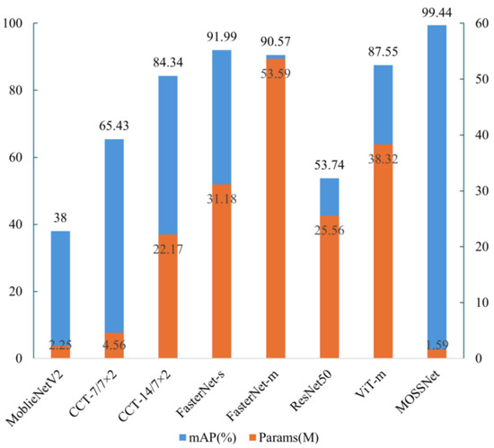 To validate the performance of the proposed MOSSNet model in the task of bryophyte classification, we conduct model performance verification experiments based on the BryophyteFine image dataset constructed. The classification performance is compared with five different models (ResNet50 [9], MobileNetV2 [37], ViT-base [28], CCT [30], and FasterNet [17]) where CCT and FasterNet include two model structures. These models cover a range of architectures and scales, including the pure CNN models (ResNet50 and MobileNetV2), the pure Transformer model (ViT-base), and hybrid models combining CNN and Transformer (CCT, FasterNet), with parameters ranging from 2.25 M to 53.59 M.