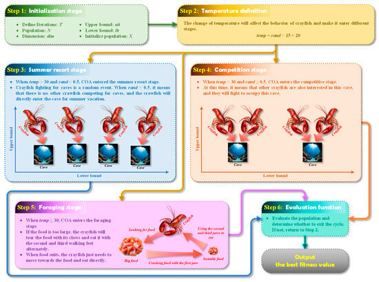 COA is a nature-inspired optimization algorithm that models the foraging behavior of crayfish. As depicted in Figure 1, COA draws its inspiration from the temperature-regulated behavioral patterns of crayfish, with temperature modeled as a stochastic variable. When exposed to excessively high temperatures, crayfish retreat into burrows to avoid overheating. In the absence of competitors, the crayfish occupy the burrow immediately, representing the cooling phase of the COA. However, if multiple crayfish target the same burrow, a competitive process ensues, marking the algorithm’s competitive phase. At optimal temperatures, the COA enters the foraging phase, where crayfish determine whether to directly consume or first process their food, depending on its size. The quantity of food consumed is proportional to their foraging capacity. By balancing these phases driven by temperature dynamics, the COA enhances its optimization performance, combining robust exploration with efficient exploitation, and it achieves faster convergence to the global optimum. A detailed explanation of the crayfish optimization algorithm is provided as follows.