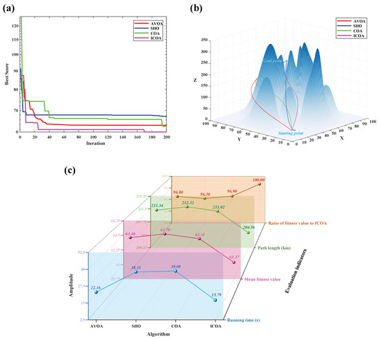 AVOA exhibits a strong initial global search capability, allowing it to quickly explore a larger search space. However, during the search process, it prematurely converges to a local optimum, which limits its ability to better avoid obstacles within the search space. As a result, the algorithm fails to reach the optimal solution in the target region. SHO demonstrates strong local optimization performance, enabling it to find good solutions in complex search spaces. Compared to AVOA, SHO mitigates the issue of premature convergence to local optima to some extent. However, it still suffers from unnecessary over-exploration, leading to a waste of computational resources and resulting in lower efficiency. COA exhibits strong local search capabilities, with smoother paths that are closer to the target region, demonstrating good convergence. However, in complex high-dimensional problems, it may still fall into local optima, limiting its ability to find the global optimal solution. ICOA demonstrates the smoothest and shortest path in the figure. It rapidly approaches the target region while effectively avoiding most local optima, ultimately reaching a highly optimal solution. Although the COA and SHO algorithms demonstrate certain advantages in global search, it is apparent from Figure 5a that they are more susceptible to getting trapped in local optima when addressing high-dimensional complex optimization problems. Although they eventually converge, their convergence speeds are relatively slow. The observed slow convergence may be attributed to an imbalance between exploration and exploitation. COA’s search behavior, inspired by the social dynamics of crayfish, allows for effective exploration of the search space, but it can sometimes converge more slowly than other algorithms, such as ICOA, which accelerates convergence through advanced mechanisms like chaotic initialization and adaptive mutation strategies. Similarly, the SHO algorithm, inspired by the movement patterns of seahorses, also faces challenges in balancing exploration and exploitation. While SHO performs well across different regions of the search space, its convergence speed tends to be slower compared to ICOA, which overcomes these limitations through improved strategies.