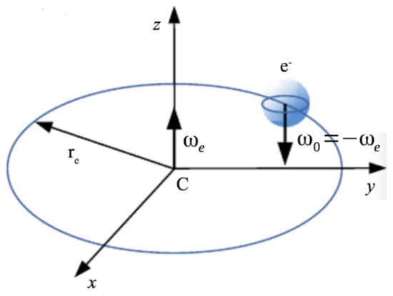 Kovacs et al. in [11] present an alternative modern treatment. Their model posits the electron charge distribution on the surface of a sphere with a radius equal to the classical electron radius ( m). Integration of electromagnetic energy over this geometry gives the electron’s mass energy as 511 keV, thus fully accounting for the electron mass as electromagnetic field energy. This concept, the equivalence of mass with electromagnetic energy, was previously noted by Hestenes. It also aligns with the definition of the classical electron radius: the radius at which electromagnetic field energy equates to the electron’s mass. We observe this scale experimentally, and, when we use it in the EM field energy calculation, it gives us precisely an electromagnetic field energy measure of 511 keV. This strongly suggests the electromagnetic nature of mass, and the identification of mass with field energy. While initially counter-intuitive, it finds support in Einsteinian relativistic mass–energy equivalence. The fact that the mass of relativistic electrons varies with the Lorentz gamma factor further suggests its electromagnetic character. The flux is quantized and rotates on a circle at the Compton radius, by hypothesis (see Figure 2).