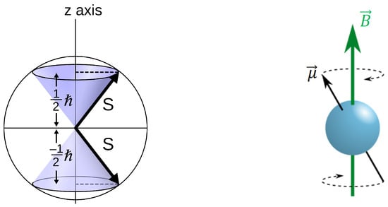 (Left) Quantum projection of the spin vector in a given direction z. (Right) Larmor precession (with magnetic moment vector and external magnetic field).