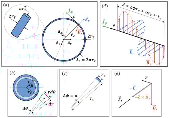 The EM torus of dos Santos. (a) The field is confined to the torus with small radius , and circulating at speed c at Compton radius (noted ). (b) shows the toroidal angle . (c) shows the arc length which is the classical electron radius , and the angle (fine structure constant). (d) Electromagnetic field with electric field (in blue) and magnetic field (in red), with wavelength and current . (e) shows the centripetal Lorentz force stabilizing this orbit around the center. (Credit: C. Dos Santos from [20].)