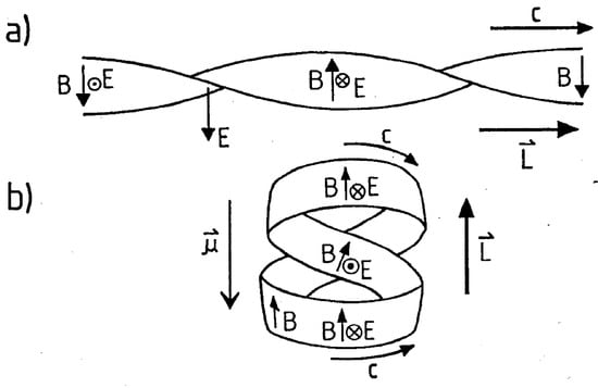 The toroidal model of Williamson. (a) Free photon with circular polarization of electric and magnetic fields /; (b) photon confined on the double loop, making the charge, magnetic moment , and orbital angular momentum (spin) appear. The toroidal structure is characterized by a radius . (Credit: from [21].)