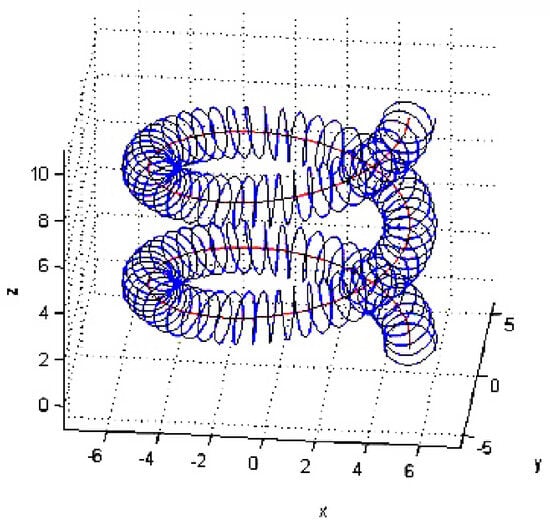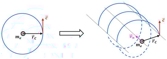 In the Dos Santos model, the internal electromagnetic wave described in Section 4.1 follows a helix path. This is the case, for example, when the electron orbits around the nucleus in the atom, from this nucleus frame (see Figure 11). In this model, the helix is characterized by different parameters: length of a coil D, radius of the helix r, helix pitch P, internal speed c, longitudinal speed v, and transversal speed (with Lorentz factor). We have the following relations: and . From this relation between speeds, we have , providing an intuitive explanation of why massive particles cannot go faster than light.