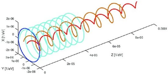 Relativistic dynamics of this electron in the model of Kovacs/Vassalo. The radius of the Zitter internal motion depends on the speed v of the particle (blue color: ; light blue: ; orange: ; red: ). (Credit: G. Vassalo.)