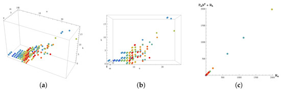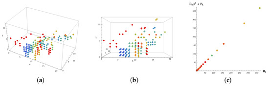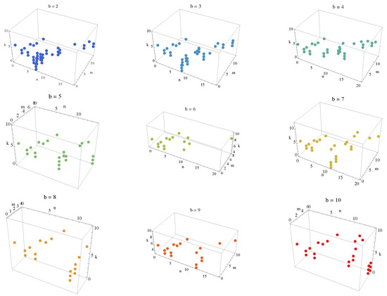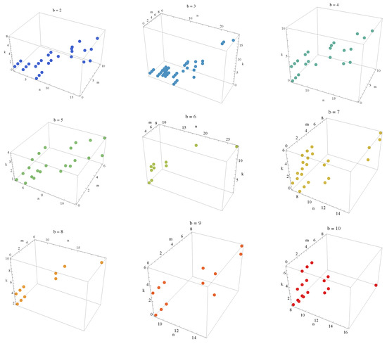 In Figure 1, the dots for each base b, where d is the length of the representation of in base b, visualize the relationship between the values n, m, and k for which the condition is satisfied. The data are plotted for the base values , with unique colors assigned to each base for better differentiation. The graph given in Figure 2a,b are the nine graphs in Figure 1 shown on a single graph and Figure 2c shows the values that satisfy the equality . The axes represent the indices n, m, and k, and the visualization helps identify patterns in the solutions for different bases.