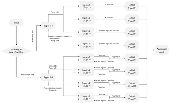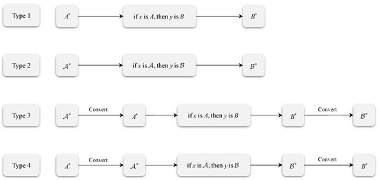 As for the inference models with consistent given if–then rules (Types 1–4), the input information first needs to be consistent with the information representation in the given rules. For example, as for Type 3, the input has the priority to be converted into the same information type as the given rule “if x is A, then y is B”; as for Type 4, the input has the priority to be converted into an intuitionistic fuzzy set , same as the representation of the given rule “if x is , then y is ”. Then, the subsequent inference steps can be performed to obtain the output with the same representation as the rule, together with the inference result consistent with the representation of the input by employing the reciprocal conversion formula between fuzzy sets and intuitionistic fuzzy sets. Figure 1 shows the processing framework of the first four types of inference models.
