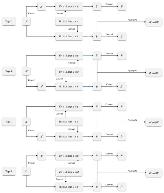 By this analysis, for each of the Types 5–8 inference problems, the input will be combined with the two consistent rules to conduct the inference process in their respective directions. Further, the conclusions in these two directions will be aggregated to obtain the final inference result for each type, as depicted in Figure 2. The final inference result will be expressed according to the representation of the input and rule consequent. When the representation of the input and rule consequent is the same, the final inference result will also be written with full consideration in the form that is different from the representation of the two, in addition to giving the final result with the same representation as the two.