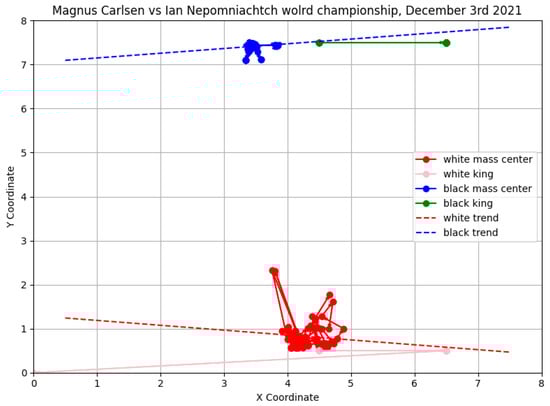Additionally, linear regressions were applied to the center of mass trajectories to uncover long-term trends, offering deeper insights into the flow of the game. The movements of the kings, as pivotal elements in the dynamics and objectives of chess, were also tracked and visualized.. This detailed analysis highlighted their critical influence on the progression and outcome of the match, further enriching our understanding of chess dynamics.