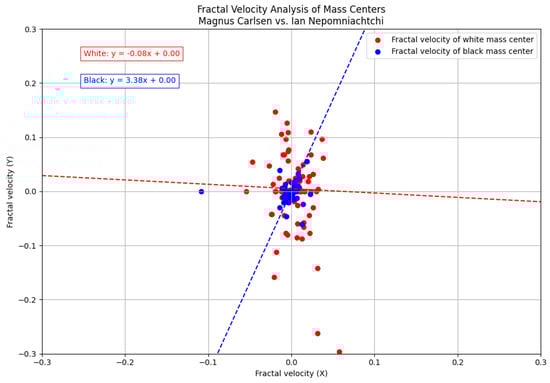 We can plot the velocity using the fractal derivatives with , as shown in Figure 2. In this analysis, the graph visualizes the dynamic shifts of the pieces in the game, revealing distinct patterns of movement. The velocities in the plot show opposite directions for the two players, which is expected since, while the black player is attacking the white side, the white player is simultaneously attacking the black side.
