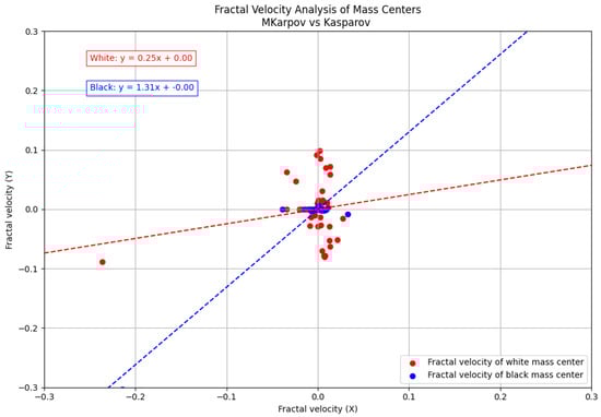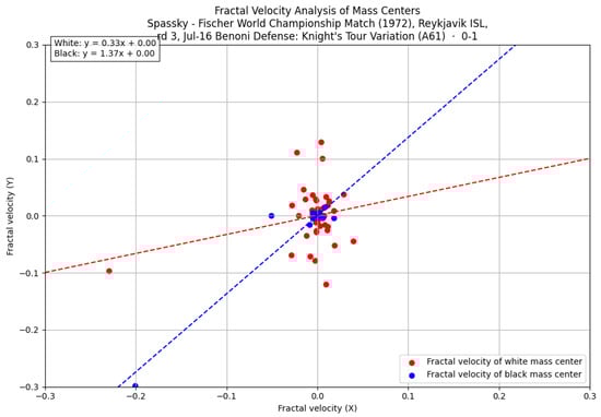 The displacement trajectories exhibit a symmetrical divergence from the respective castling sides, while the computed fractal velocities display an almost perpendicular orientation. This phenomenon indicates that, although piece movements were predominantly directed toward the left flank, velocity vectors were oriented toward the opponent’s position, thereby highlighting a distinct tendency toward offensive play.