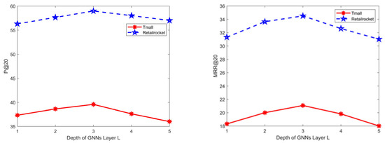 To assess the model’s performance with varying layer depths, experiments were conducted across different datasets. Figure 3 presents the experimental results for each dataset in terms of P@20 and M@20.