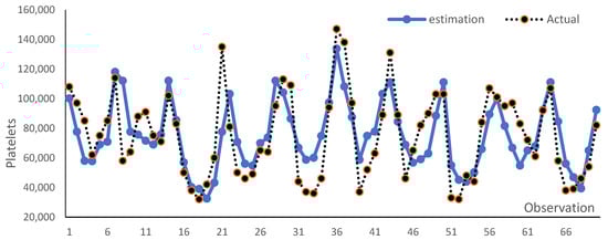 Based on Equations (46) and (47), every 1 g/dL increase in hemoglobin variable will cause platelets to decrease by 10,637.5/mm3, and hematocrit to increase by 2.62%, which was experienced by the seventh patient on the second day of hospitalization.