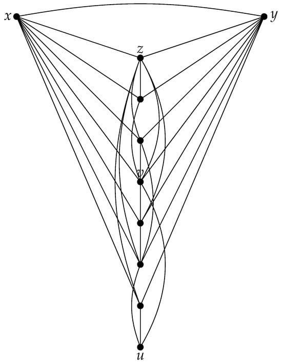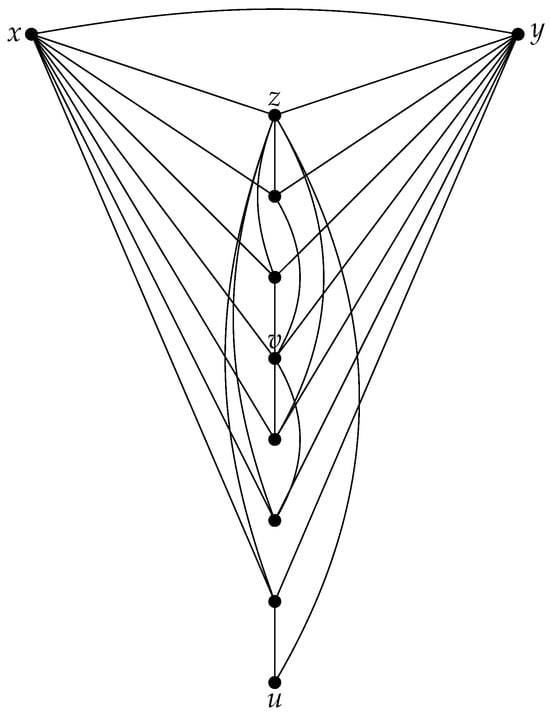If , then no graph G satisfies the above assumptions. Let and , , such that and are not adjacent, and . Suppose that there exists a unique vertex such that and it is adjacent to x and y. Because and a vertex is adjacent to x and y, it implies that u is the only vertex of a graph G that is not adjacent to a vertex z; otherwise, . Hence, and . Then, sets or are -PDS of a graph G. An example of such a graph for , where and , is shown in Figure 1.