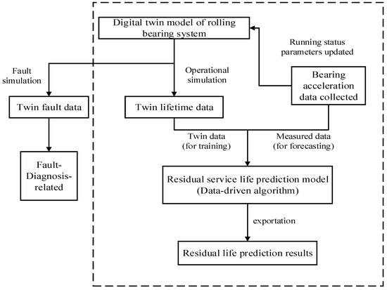 To enhance the maintenance efficiency and operational stability of rolling bearings, this work establishes a methodology for bearing life prediction, employing digital twin systems to evaluate the remaining useful life of rolling bearings. A comprehensive digital twin-integrated model for the entire lifecycle of rolling bearings is constructed using the Modelica language. This model generates sufficient and reliable lifecycle twin data for the bearings. Due to the symmetrical physical structure of the bearings, the generated twin data also have symmetry. Based on this characteristic of bearings, a remaining useful life (RUL) prediction algorithm is developed using a recurrent neural network (RNN), specifically an improved gated recurrent unit (GRU) model. An optimization algorithm is employed to adjust the hyperparameters and determine the initial fault point of the bearing. A multi-feature dataset is constructed, effectively enhancing the precision and reliability of lifespan estimation. Based on existing measured data of the bearing’s entire lifecycle, the rolling bearing’s digital twin-integrated model parameters are updated. Through the parameter degradation component of the twin, the lifecycle twin data of the rolling bearing are generated. By combining twin data with actual measurement data, this method addresses the limitations of traditional approaches in situations where complete lifecycle data of bearings are scarce, providing reliable technical support for the intelligent maintenance and optimization of rolling bearings.