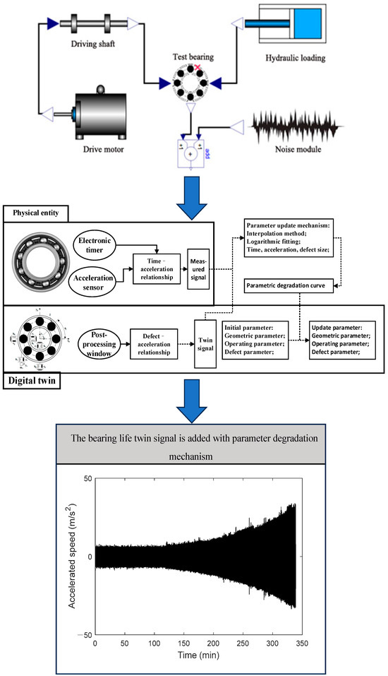 The full-lifecycle digital twin-integrated model for rolling bearings updates parameters through the degradation component of the twin model, generating comprehensive lifecycle twin data for rolling bearings. By integrating twin data with actual measured data, this approach overcomes the limitations of traditional methods, which often suffer from insufficient full-lifecycle data for bearings. This integration provides reliable technical support for intelligent maintenance and optimization, improving the practicality of prognostic outcomes. The fusion method is depicted in Figure 2.
