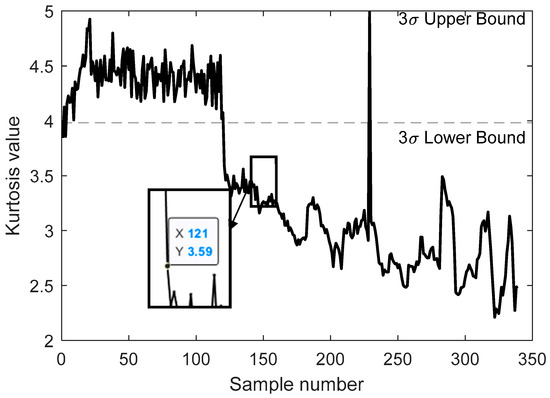 Similarly, for the kurtosis feature values from group 50 to group 100, the average value is 4.3984, and the standard deviation is 0.1374, resulting in a kurtosis distribution range of (3.9862, 4.8106). The kurtosis values for near-degradation data groups (118, 119, and 120) were calculated as 4.5960, 4.0191, and 4.0749, respectively, also conforming to the criterion distribution. This confirms that the rolling bearing operates stably and generally during this stage.
