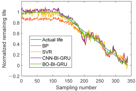 Comparative experiments are conducted with other methods to verify the proposed method’s effectiveness and applicability. The methods compared include the backpropagation (BP) neural network, the Support Vector Regression (SVR) method, the CNN-BI-GRU model, and the proposed method. Method (1): BP neural network: A classical BP neural network, one of the fundamental network models, is used. The network has three hidden layers with 128, 64, and 32 units. The learning rate is set to 0.001, and the Adam optimization algorithm is applied. Method (2): Support Vector Regression (SVR): the radial basis function (RBF) kernel is used to enhance the SVR model’s nonlinear fitting ability. Method (3): CNN-BI-GRU model: CNN is employed to extract deep features, while BI-GRU is used to learn temporal sequence characteristics to predict rolling bearing RUL. The network consists of one convolutional layer and two BI-GRU layers. Method (4): the proposed BO-BI-GRU model: BI-GRU is used to learn temporal sequence characteristics. The network consists of three hidden layers, with Bayesian optimization applied to select optimal hyperparameters for improved RUL prediction accuracy adaptively. The results of all methods are illustrated in Figure 10.
