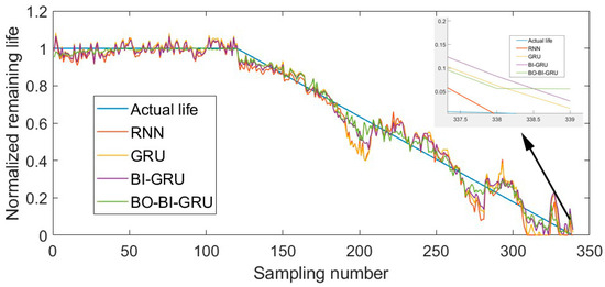 The RUL prediction results based on the BO-BI-GRU network exhibit a trend consistent with the experimental data. In the experiment’s early stages, the bearing’s unstable operation during the running-in process causes fluctuations in the initial data. However, these fluctuations quickly disappear, and the data return to a stable state, indicating healthy bearing operation with the RUL remaining around 100%. Around data group 121, the predicted RUL values decline, marking the official onset of bearing degradation. Between data groups 180 and 220, the prediction results exhibit significant fluctuations. During this phase, the rolling bearing transitions from mild to moderate degradation, causing a sharp decline in the RUL. However, as the operation continues, the bearing condition stabilizes, though degradation remains an ongoing process. The overall degradation level deepens over time, exhibiting some degree of fluctuation. At data group 330, the predicted RUL values fluctuate with increasing amplitude, signaling that the bearing is approaching failure. To further validate the effectiveness of the proposed BO-BI-GRU model, an ablation study is designed to compare performance with other methods. Table 4 presents the RMSE, MAE, and R2 values for the prediction results of different methods. The ablation results are shown in Figure 11.
