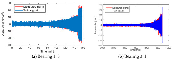 The experimental data used in this section are from the same dataset as that used in the full-lifecycle signal analysis, namely, the XJTU-SY bearing dataset. The measured signal data from bearings 1_3 and 3_1 are selected as the test signals for the experiment. The digital twin full-lifecycle signals corresponding to these two bearings are shown in Figure 12, where Figure 12a represents the bearing 1_3 signal, and Figure 12b represents the bearing 3_1 signal; since the overall runtime of bearing 3_1 is longer, and its degradation phase starts later, only the data after 2000 min are extracted for the experiment.