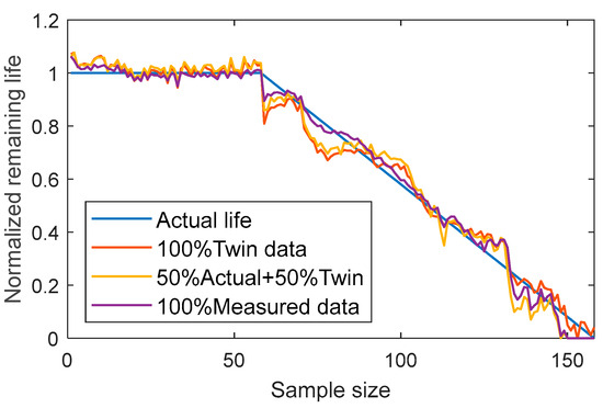 To further validate the effectiveness of digital twin data, a model is trained using 100% real measured data. The results indicate that the model trained solely on real measured data produces the most accurate prediction curve, closely matching the actual lifespan curve. This demonstrates that real measured data carry more accurate degradation information, improving the model’s ability to predict complex degradation behaviors.