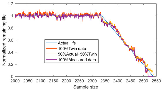The first data combination trains the model entirely using digital twin data. The results indicate that the model trained with 100% digital twin data can effectively capture the overall declining trend of the RUL. However, a noticeable discrepancy exists between the predicted and actual RUL trajectories.