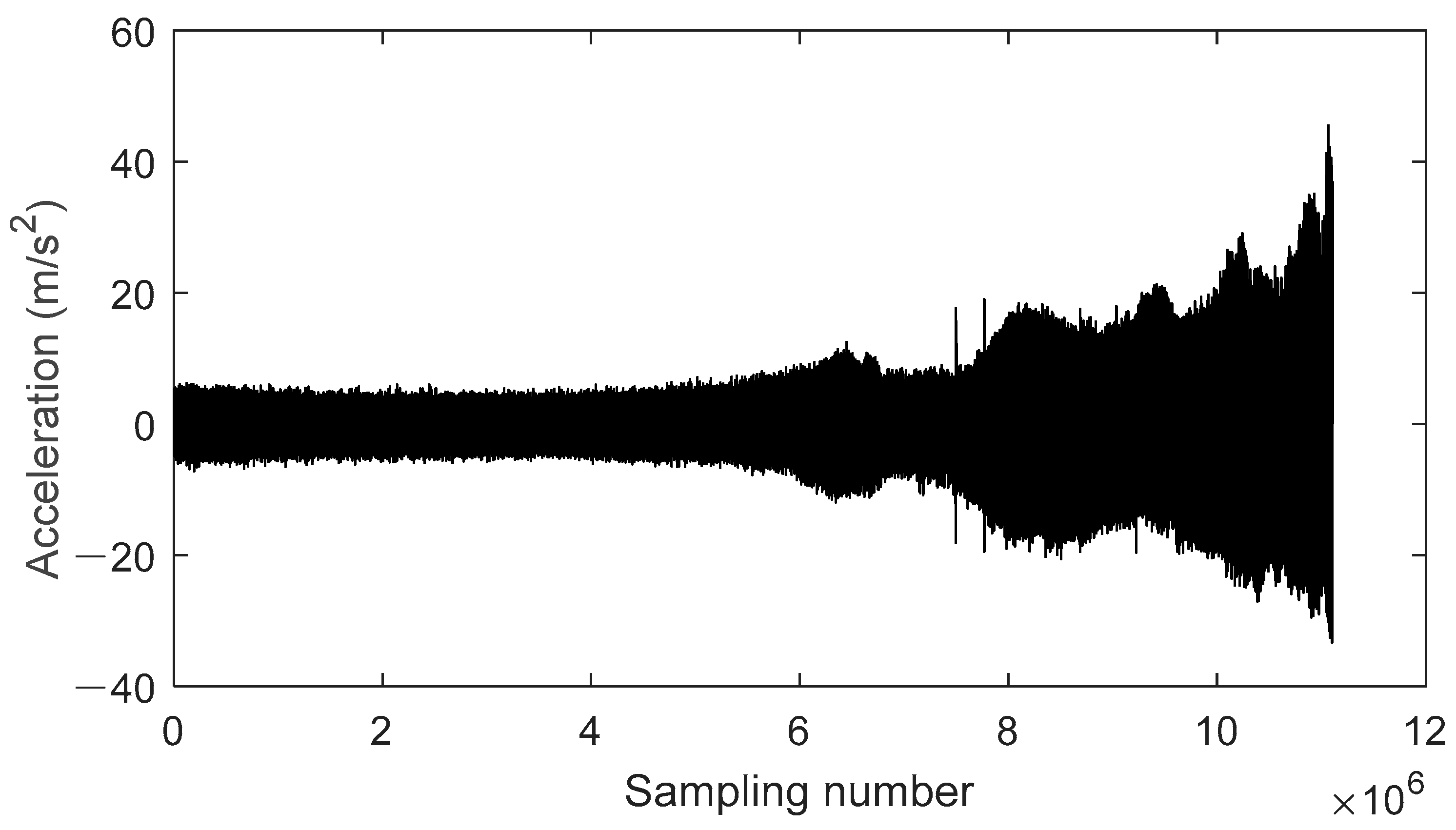 Taking the full-lifecycle data of bearing 2_5 under 37.5 Hz and 11 kN loading conditions from the XJTU-SY bearing dataset as an example, the first fault point identification process was conducted. The y-direction vibration acceleration signal is shown in Figure 7.