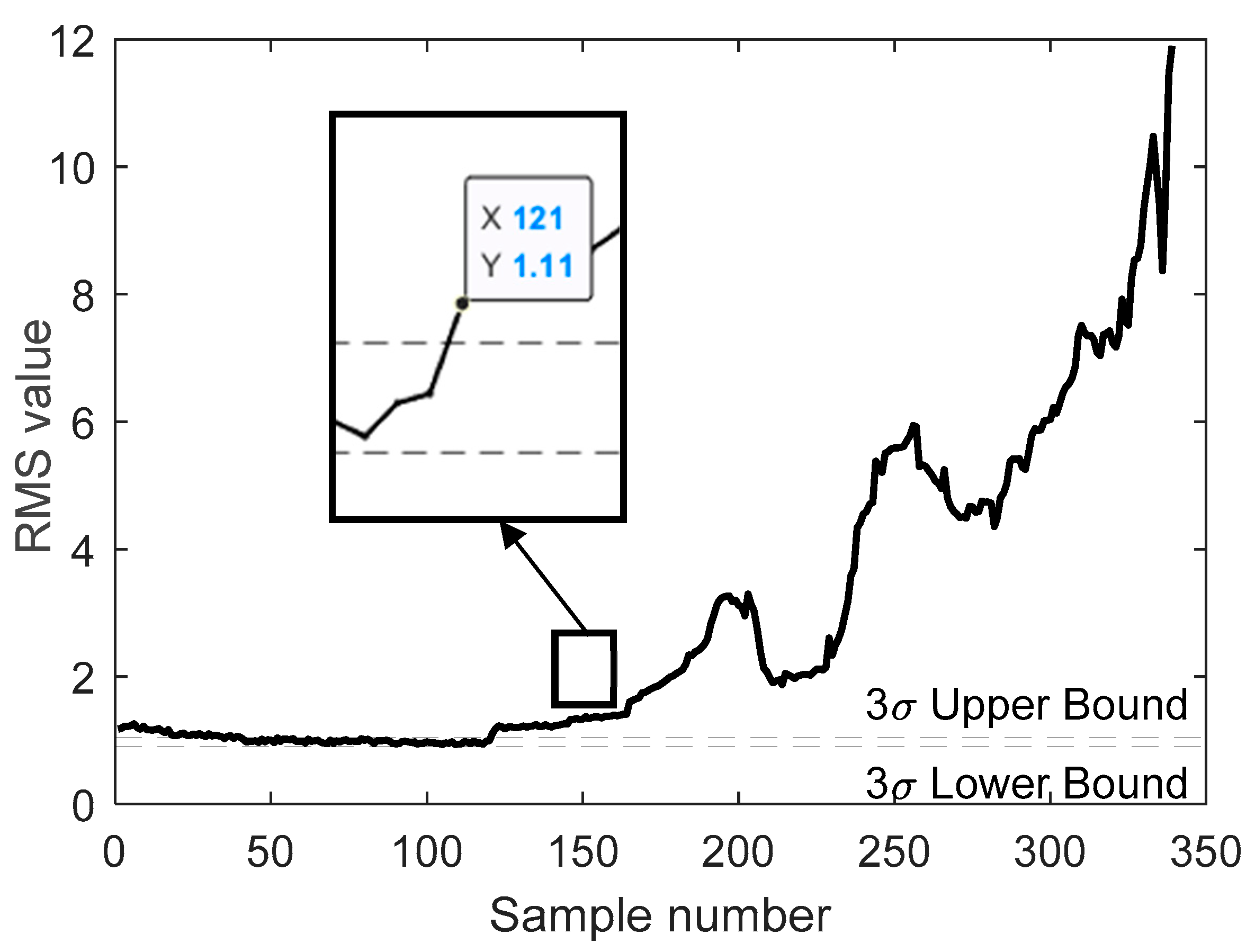 The criterion is used to determine the first fault point. Under normal operating conditions, the vibration signal data usually conform to the criterion. However, in a fault state, the vibration signal deviates from the normal distribution, producing anomalous data points that exceed the confidence interval. Therefore, the first occurrence of an outlier beyond the regular interval can be used to distinguish the healthy state from the fault state, serving as the starting point of rolling bearing degradation.