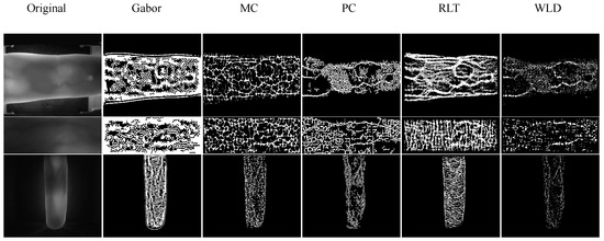 Figure 1 illustrates finger vein extraction results using five traditional methods—Gabor, MC, PC, RLT, and WLD. The first row shows a vein pattern extracted from an SDUMLA-HMT image, while the second and third rows show FV-USM images processed similarly. In the experiments conducted in this study, we also observed that traditional vein extraction methods relied on image quality. These methods often utilize information such as contrast and intensity from the original finger vein images to extract vein features [12]. Each method extracts vein features along with varying levels of image noise, making it challenging to distinguish vein structures from noise. When the image quality is low, as illustrated in the second row, the extracted vein patterns are difficult to correlate with the original finger vein images.