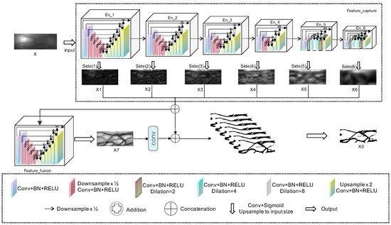 The main function of the Feature Fusion module is to fuse feature maps of different levels, output a feature map with 64 channels, and then use a convolution layer to transform the feature map’s channel number to 1. During model training, after the conclusion of each epoch, the loss values are calculated for the feature maps outputted by the Feature Capture module and the Feature Fusion module, respectively, then the average of these seven loss values is back-propagated. During finger vein segmentation, the feature maps of 6 levels (now with 6 channels) are merged via a channel concatenation technique, and after passing through a sigmoid function, it outputs an image matrix with values between 0 and 1. Each element in the matrix represents the probability that the pixel at that location belongs to the finger vein area. The larger the element value, the greater the probability that the pixel is classified as part of the finger vein area.
