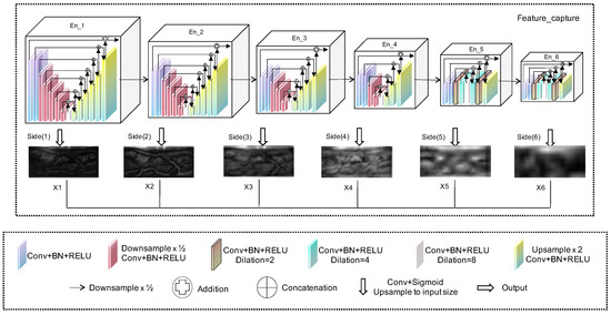 The core of the Feature Capture module consists of six encoding blocks, where the first four blocks are RSU blocks and the last two are RSU4F blocks. Each RSU or RSU4F block essentially has the structure of a complete Unet. The structure diagram of the Feature Capture module is shown in Figure 3, where En_1, En_2, En_3, and En_4 are RSU blocks, and En_5 and En_6 are RSU4F blocks. The difference between RSU and RSU4F is that the latter replaces upsampling and downsampling with dilated convolutions. This practice refers to the original Unet++ model, allowing the model to expand the receptive field, retain spatial resolution, reduce information loss, and alleviate the vanishing gradient problem [28,29].