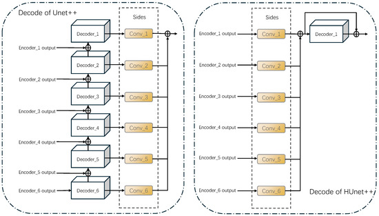 As illustrated in Table 2, this study compared the parameter configurations of four models: Unet++, HUnet_32m, HUnet_36m, and HUnet_40m. In these models, the “hid, in, out” column represents the “hidden, input, output” of each module, and the “n” of En_n is the depth of each module. Specifically, in each of these models, the encoder component consisted of six En_n units. Regarding the decoder architecture, the Unet++ model included five De_n units, whereas the other three models contained only one De_5 unit.